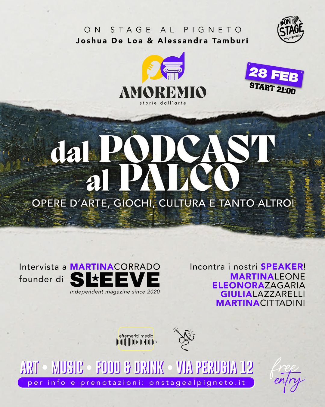 Innanzitutto è un modo per festeggiare tutti quanti insieme la fine della pubblicazione degli episodi della prima stagione del podcast. Tra i tanti ci saranno anche alcuni speaker che hanno partecipato al progetto, quali le dott.sse Martina Leone, Eleonora Zagaria, Martina Cittadini e Giulia Lazzarelli. Inoltre, durante la serata avremo anche l’onore di ospitare Martina Corrado, fondatrice della rivista Sleeve, per un’intervista speciale!